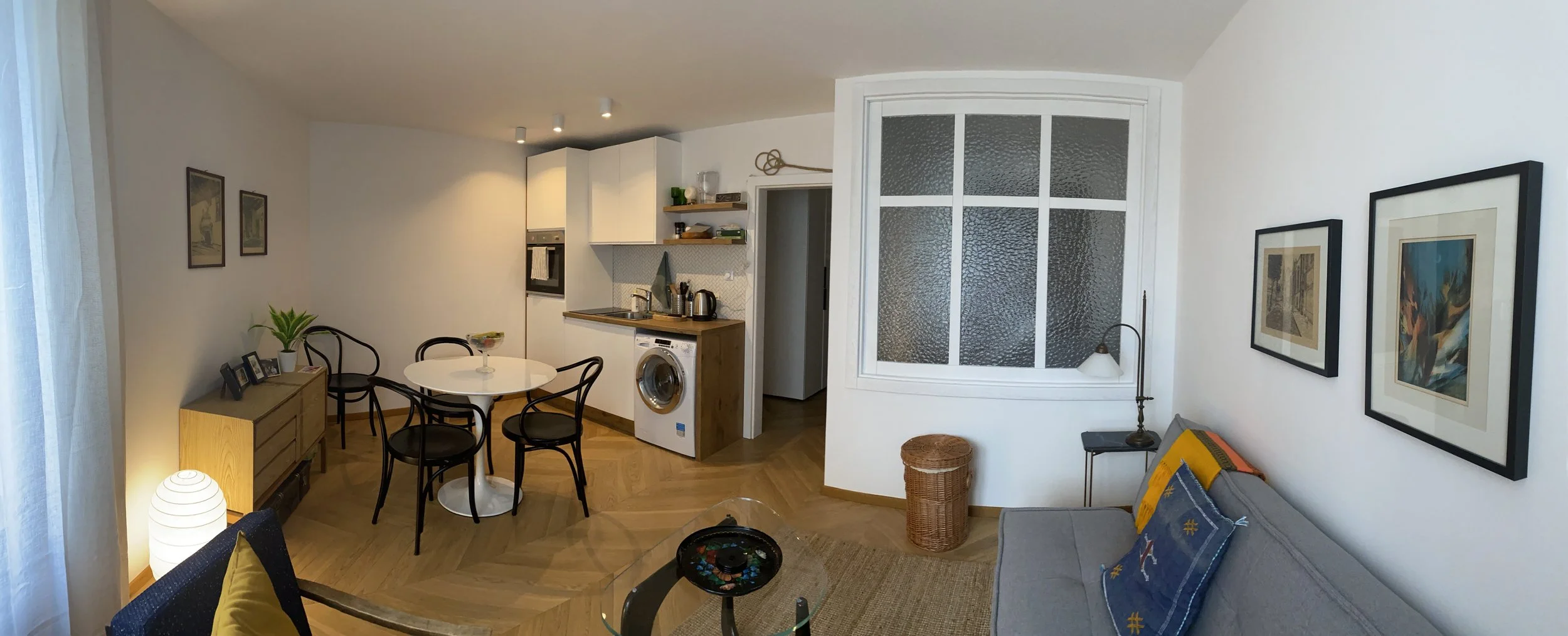 Details: With a modest footprint of just 27 square meters, the small studio underwent a significant transformation. Left untouched since the 1970s, the client sought to preserve the apartment's original charm and style while introducing modern upgrades. A key addition was a sleeping nook, where the kitchen used to be, seamlessly integrated to maximize space efficiency. Brightening the studio was a priority, especially given the sole window, with design elements strategically employed to create an illusion of spaciousness. Despite its size, the kitchen was thoughtfully outfitted to encompass all essential amenities, ensuring functionality without compromise. The result is a revitalized studio that balances vintage allure with contemporary comfort, offering a cozy yet airy retreat in the heart of the city.